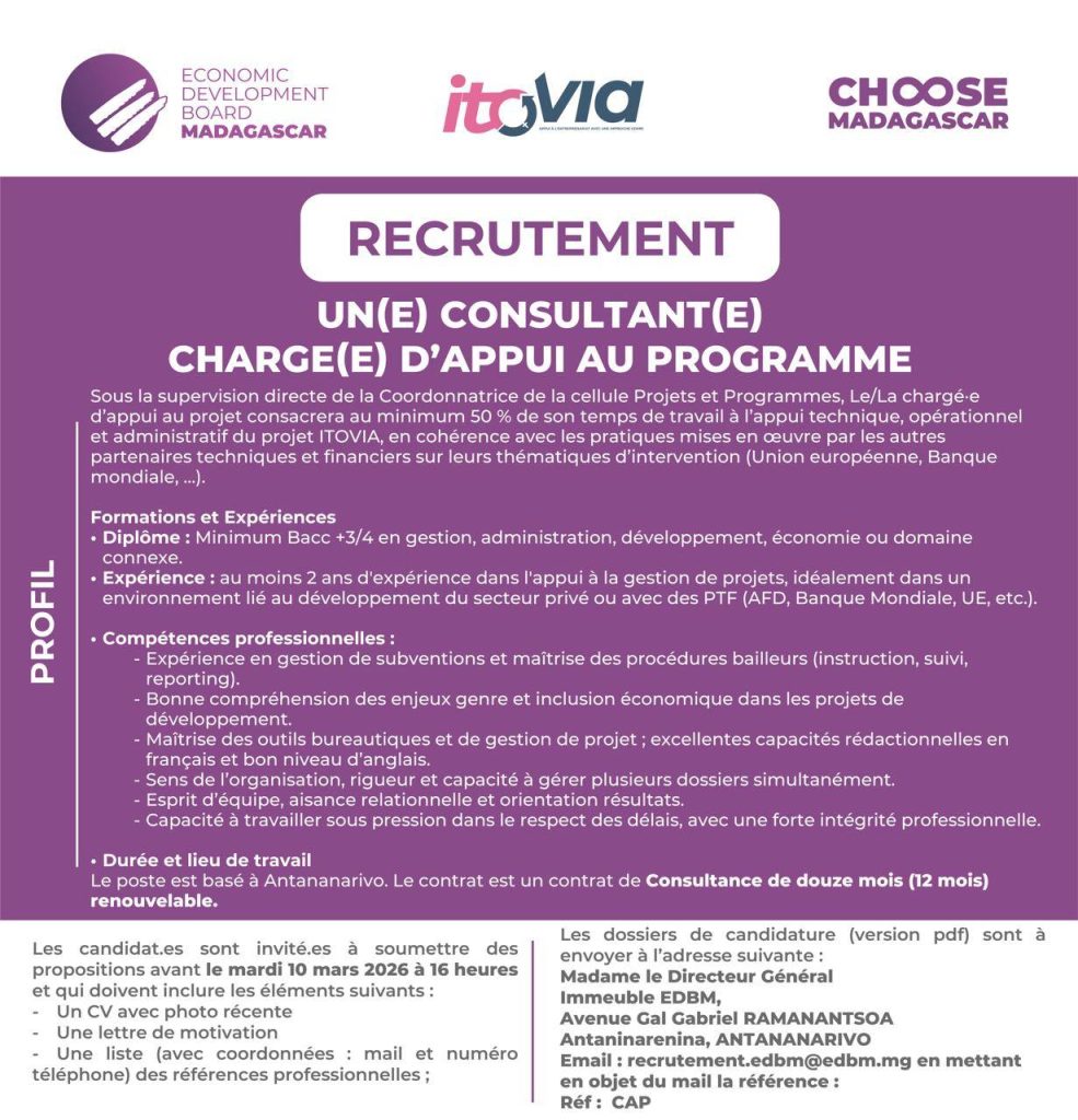 Dans le cadre du renforcement de ses capacités opérationnelles et de la mise en œuvre du projet ITOVIA – Projet de réduction des inégalités de genre par l’entrepreneuriat et l’accès des femmes aux opportunités économiques, appuyé par l’ AFD – Agence Française de Développement – l’EDBM recrute et recherche des profils qualifiés pour les postes suivants (détails à consulter via les liens ci-dessous):