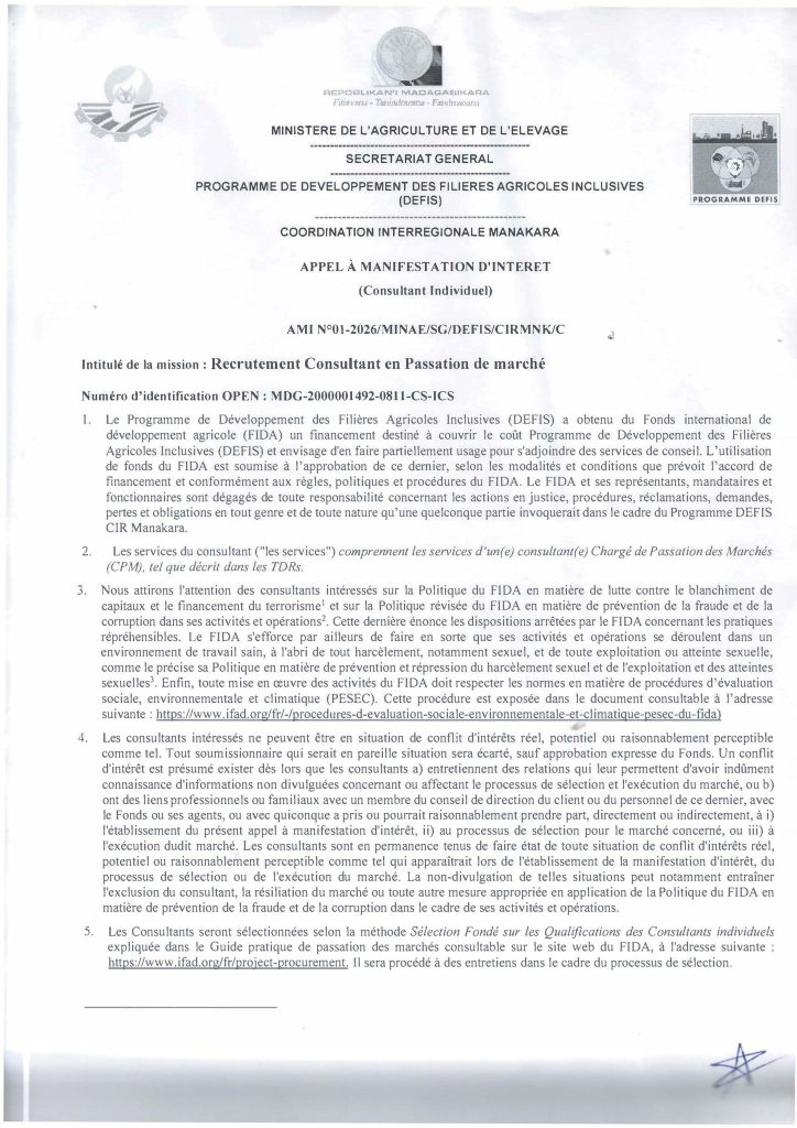 Le Programme de Développement des Filières Agricoles Inclusives (DEFIS), financé par le FIDA et sous tutelle du MINAE , lance un Appel à Manifestation d’Intérêt pour le recrutement d’un(e) Consultant(e) Individuel(le) en Passation de Marchés, basé(e) à Manakara.