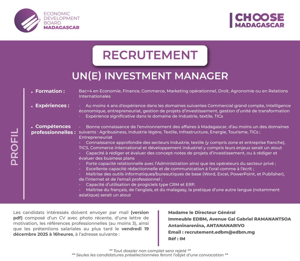 L’EDBM est un Etablissement Public à caractère Industriel et Commercial (EPIC). Dans son rôle d’agence de promotion des investissements, l’Economic Development Board of Madagascar (EDBM) se trouve au cœur d’un écosystème permettant de faire face aux enjeux et aux défis de la relance économique du pays, à travers la mise en place d’un environnement favorable aux affaires, la facilitation et l’assistance de projets d’investissements ainsi que la promotion des opportunités d’investissements. Afin de remplir convenablement ses missions, l’EDBM recrute :