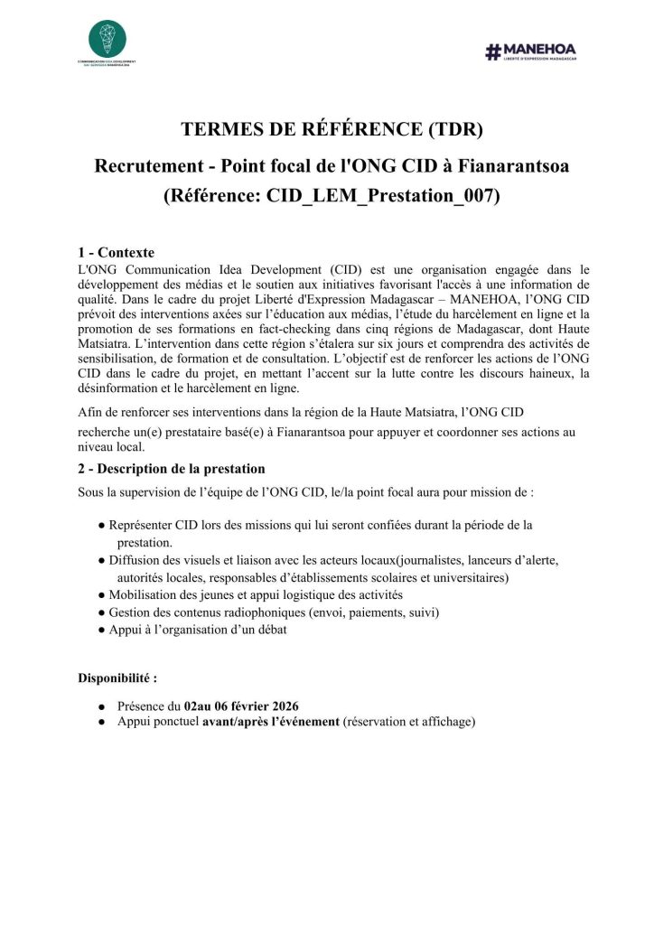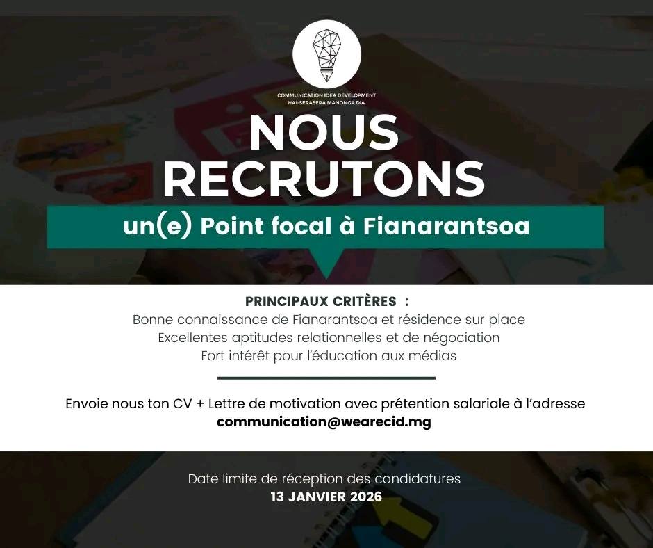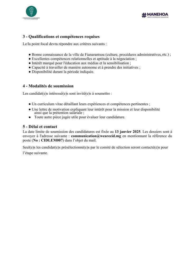 Envoyez votre dossier à 𝙘𝙤𝙢𝙢𝙪𝙣𝙞𝙘𝙖𝙩𝙞𝙤𝙣@𝙬𝙚𝙖𝙧𝙚𝙘𝙞𝙙.𝙢𝙜 avant le 13 janvier 2026 (objet : CIDLEM007).