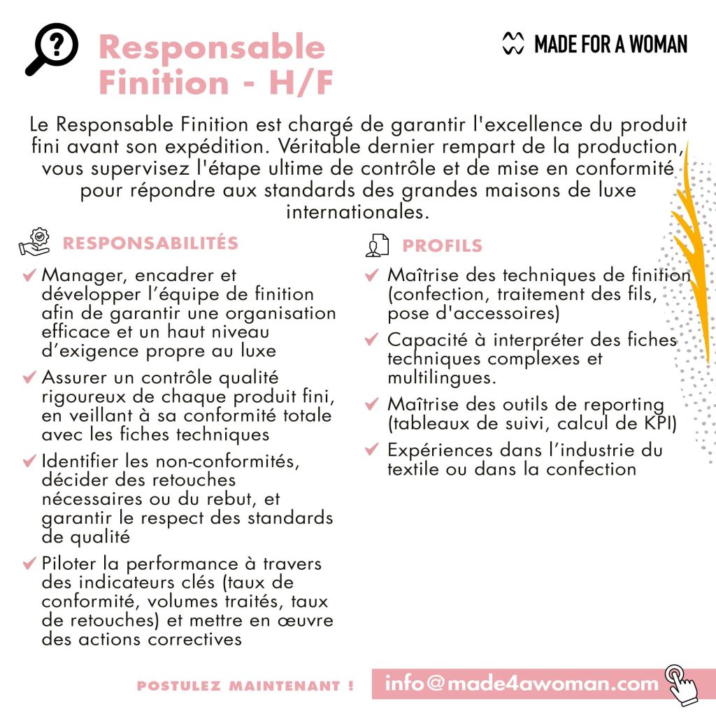 Rejoignez une équipe où chaque talent compte et où chaque mission a du sens en envoyant votre dossier (CV + LM) à info@made4awoman.com