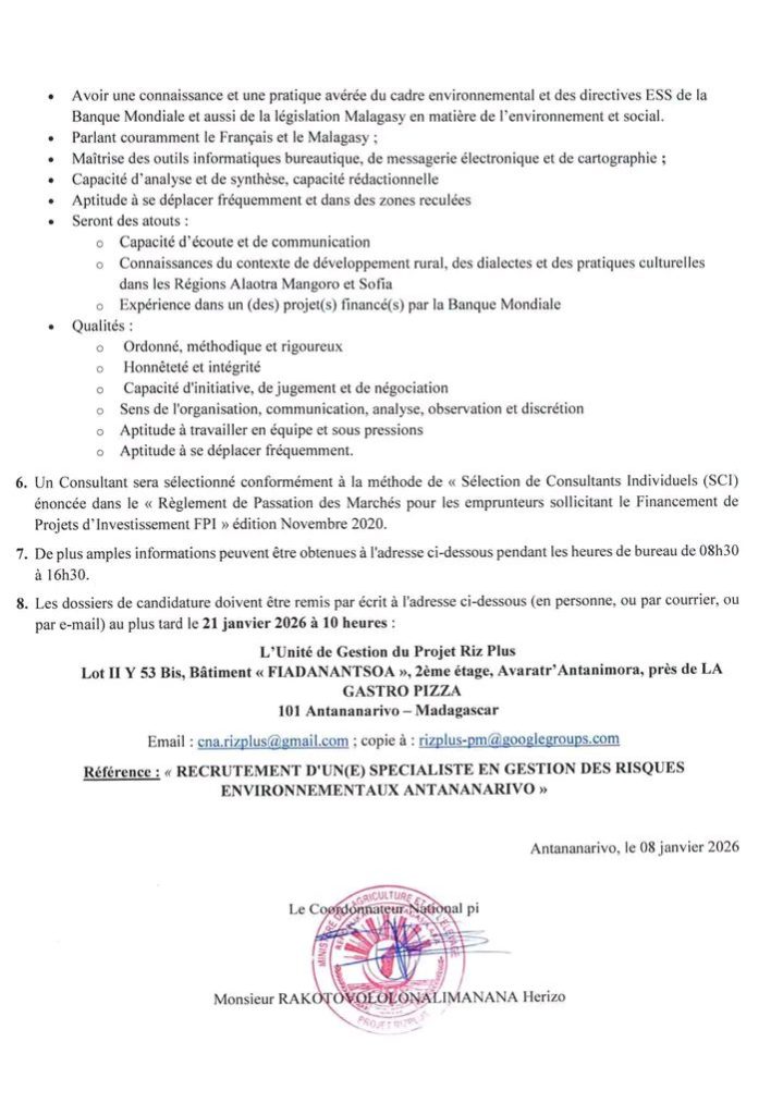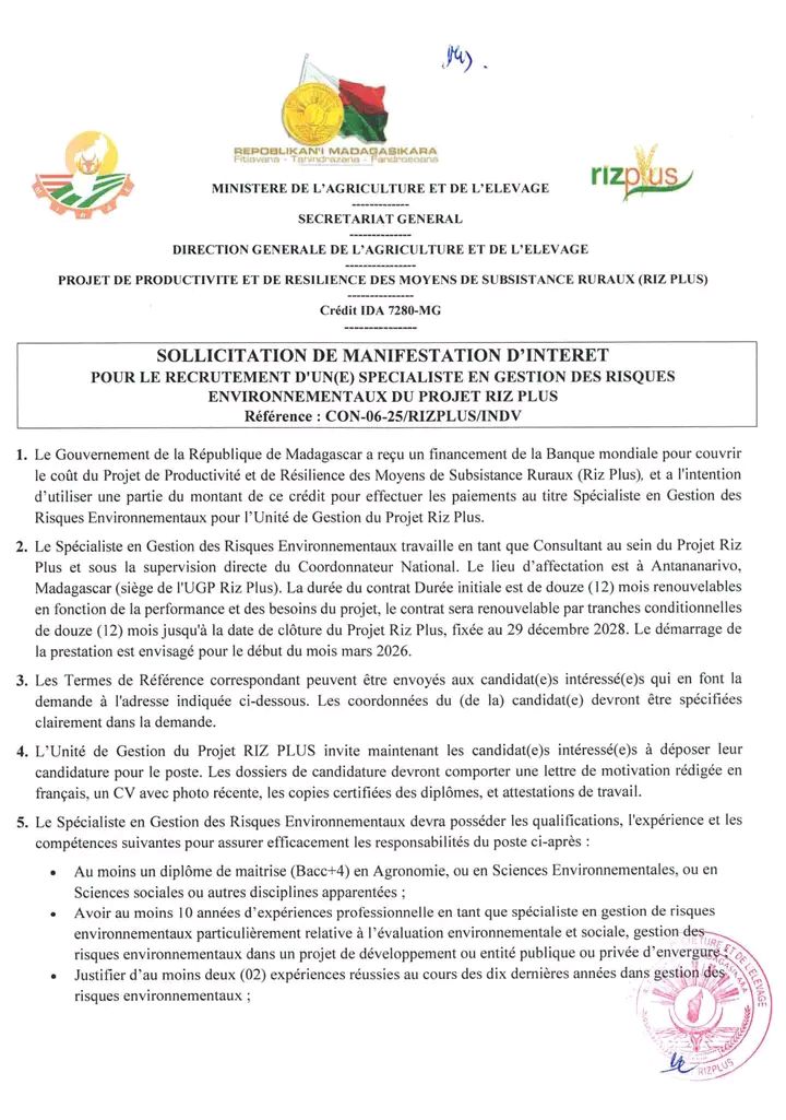 #AMI: POUR LE RECRUTEMENT D’UN(E) SPECIALISTE EN GESTION DES RISQUES ENVIRONNEMENTAUX DU PROJET RIZ PLUS
