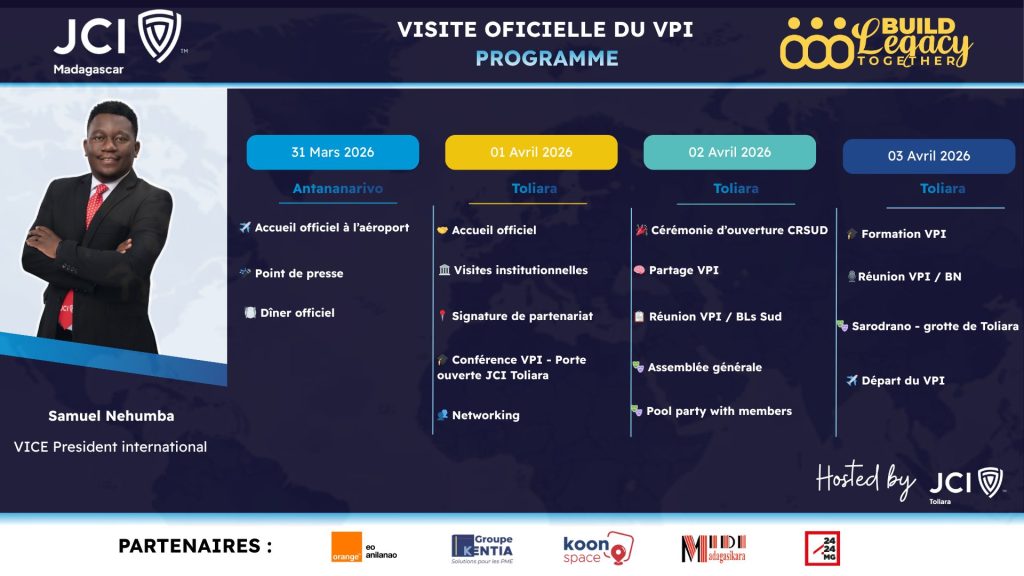 Pour ne rien râter de cette visite officielle, suivez les pages JCI Madagascar et Conférence Régionale Zone Sud 2026 ou rejoignez-nous pour un accueil en grandes pompes le 31 mars à l”Aéroport international d’Ivato ou le 1er avril à Toliara.