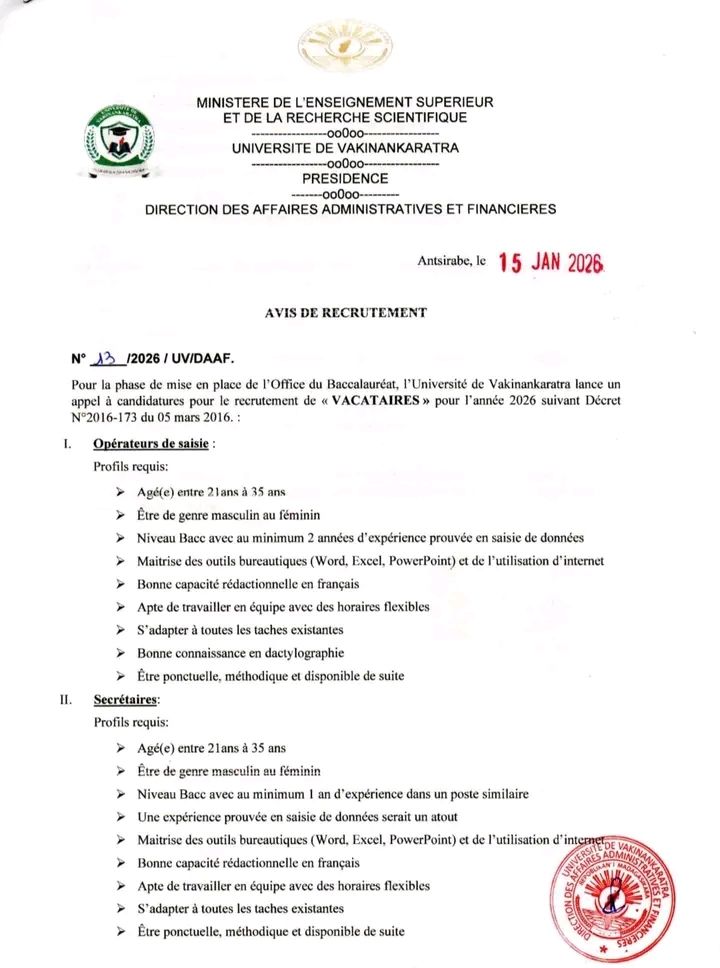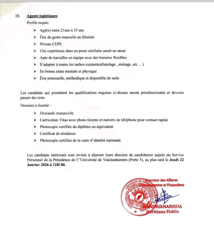 Date limite des dépôts de candidatures : Jeudi 22 Janvier 2026 à 12H00