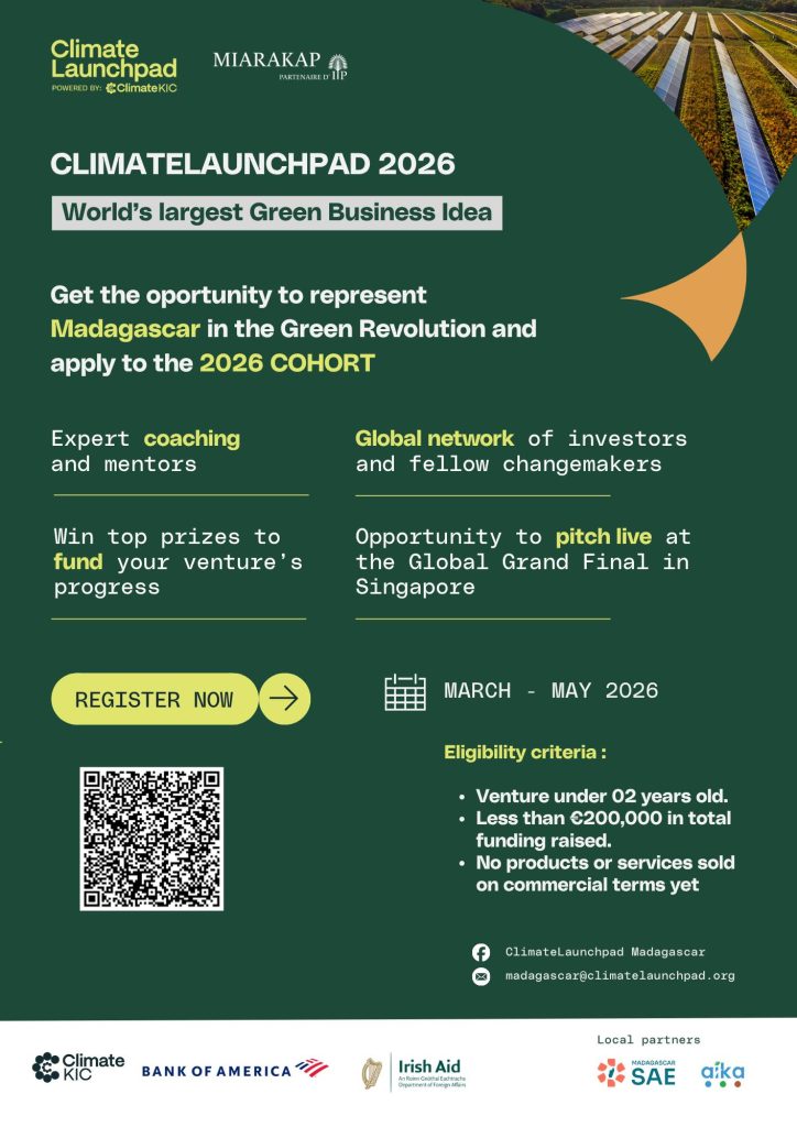 En tant que 𝗡𝗮𝘁𝗶𝗼𝗻𝗮𝗹 𝗟𝗲𝗮𝗱 𝗼𝗳𝗳𝗶𝗰𝗶𝗲𝗹 de ClimateLaunchpad 2026 à Madagascar, Miarakap vous invite pour un webinaire exclusif de présentation du programme ClimateLaunchpad 2026 ce 𝐕𝐞𝐧𝐝𝐫𝐞𝐝𝐢 𝟐𝟒 𝐀𝐯𝐫𝐢𝐥 à 𝟏𝟒𝐡.