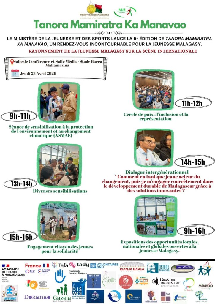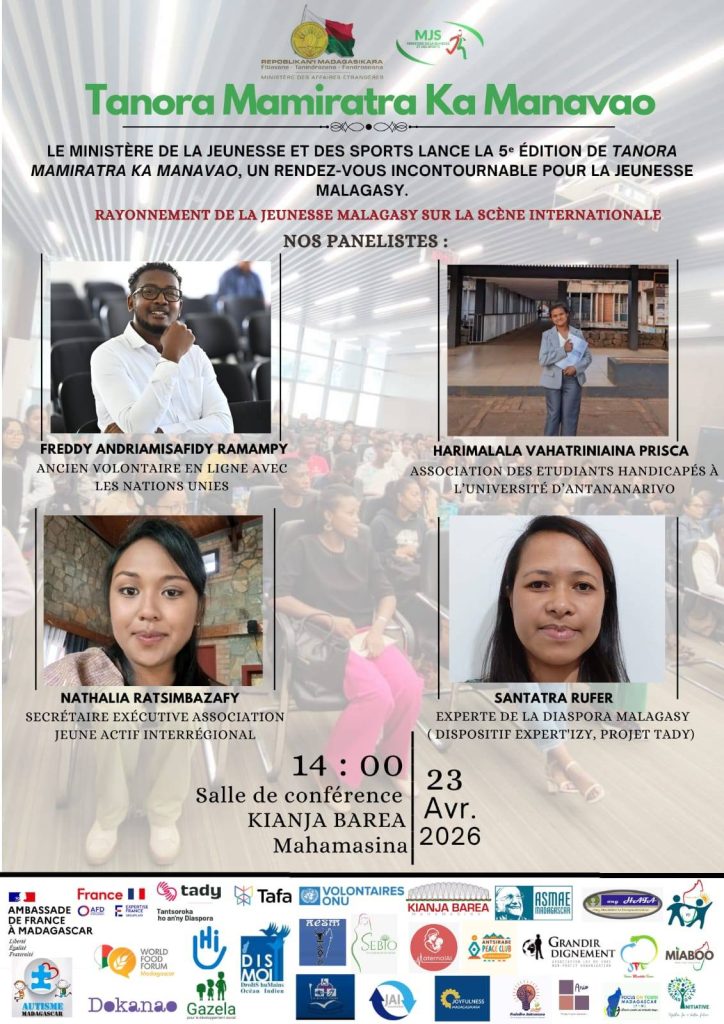 Jeunes, il vous fait du bien d’assister et de participer activement à l’événement qui se tiendra le jeudi 23 avril 2026 au stade Barea Mahamasina (salle de conférence et salle des médias) de 9h à 16h de l’après-midi